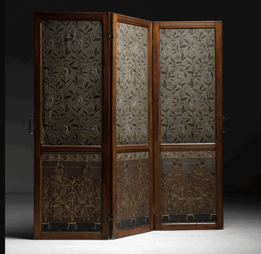Photo: Decorative Lincrusta-Walton Screen with a mahogany frame, designed by Dr Christopher Dresser c.1900.