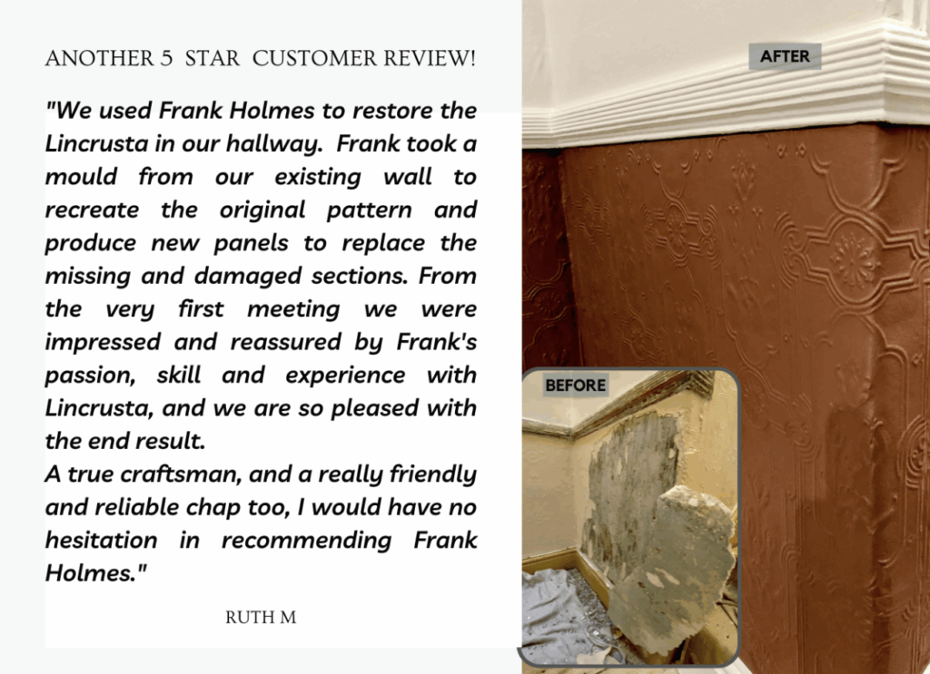 As an Approved Lincrusta Restorer based in NW England, Frank is trained to use a restoration kit, specially developed by Lincrusta to reproduce vintage designs in panels of up to 1 sq. m.The same process can be used to replicate other similar raised relief Victorian wallpapers including Anaglypta, Cameoid, Cordelova, Salamander, Lignomur and Tynecastle, all of which may still be found in period properties today.