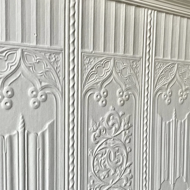 This Victorian mill manager’s house was converted into two homes in 1890 and this amazing example of Lincrusta-Walton dado dates from that time. A full 130 years on it has not lost its fine detail, due to not being painted too frequently, and is in fantastic condition.
