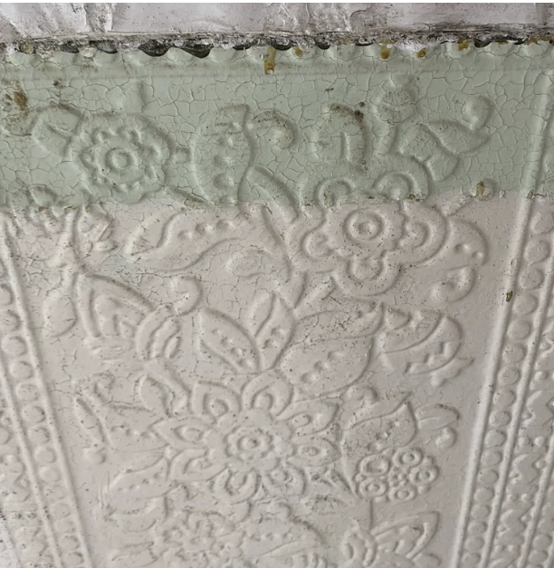 We ventured down a dark corridor that was mid-renovation. Paul rigged up a light and directed it through an exposed area of suspended ceiling. With dust in the air, caught by the light, I peered up though the frame and into the void above the false ceiling. What I saw took me completely by surprise! I felt like Howard Carter must have done when he first peered into the tomb of Tutankhamun. Maybe a slight exaggeration but I saw a stunning raised relief wallpaper and frieze that appeared untouched since it was first installed. Click to see the view for yourself on my Instagram post and see the frieze here
