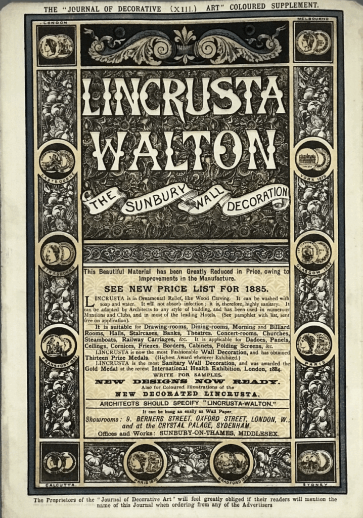 An advertisement for Lincrusta-Walton, also known as The Sunbury Wall Decoration, acquired for our collection with thanks to Carl Burgess, CB Fine Painting, USA.