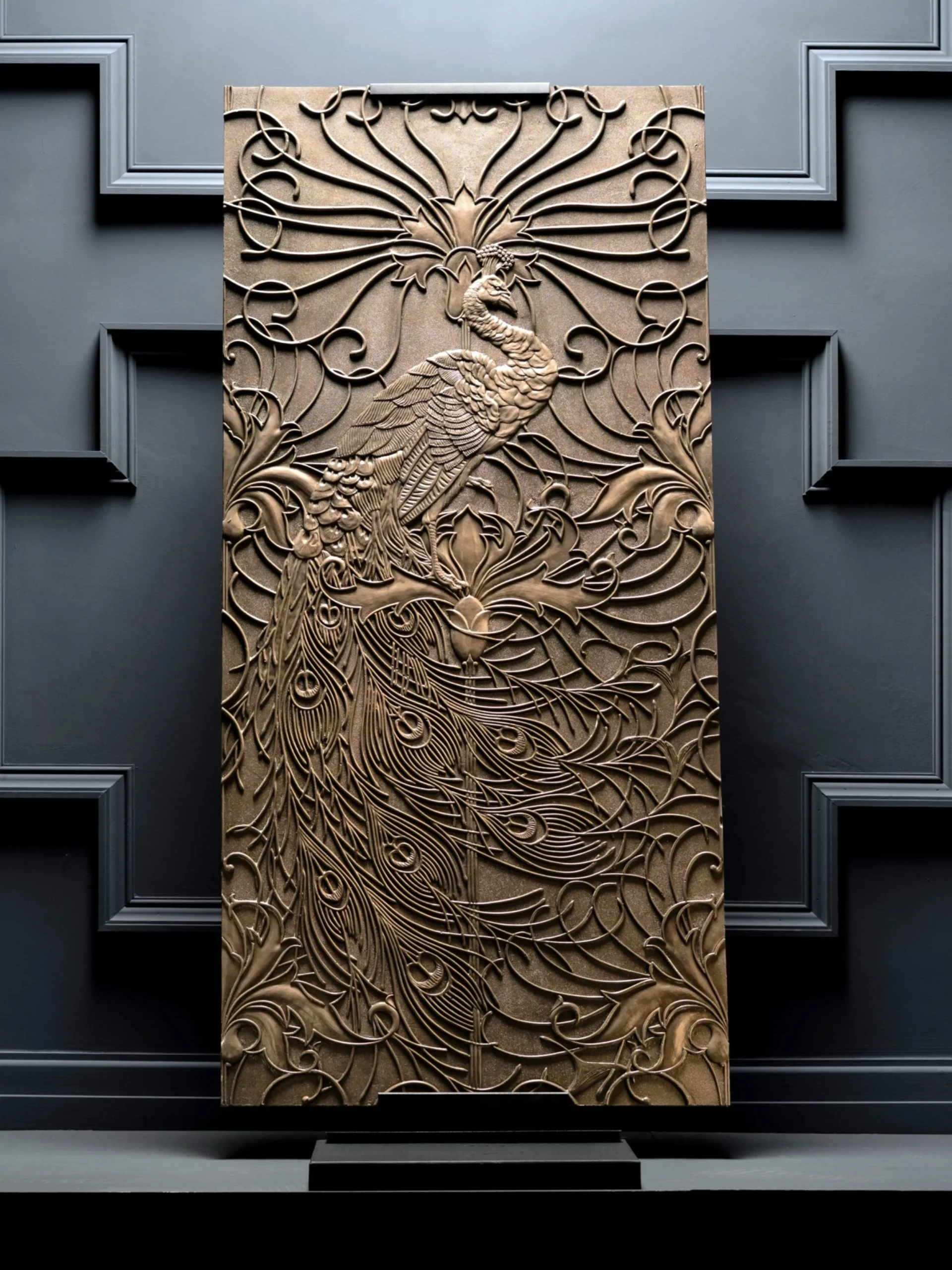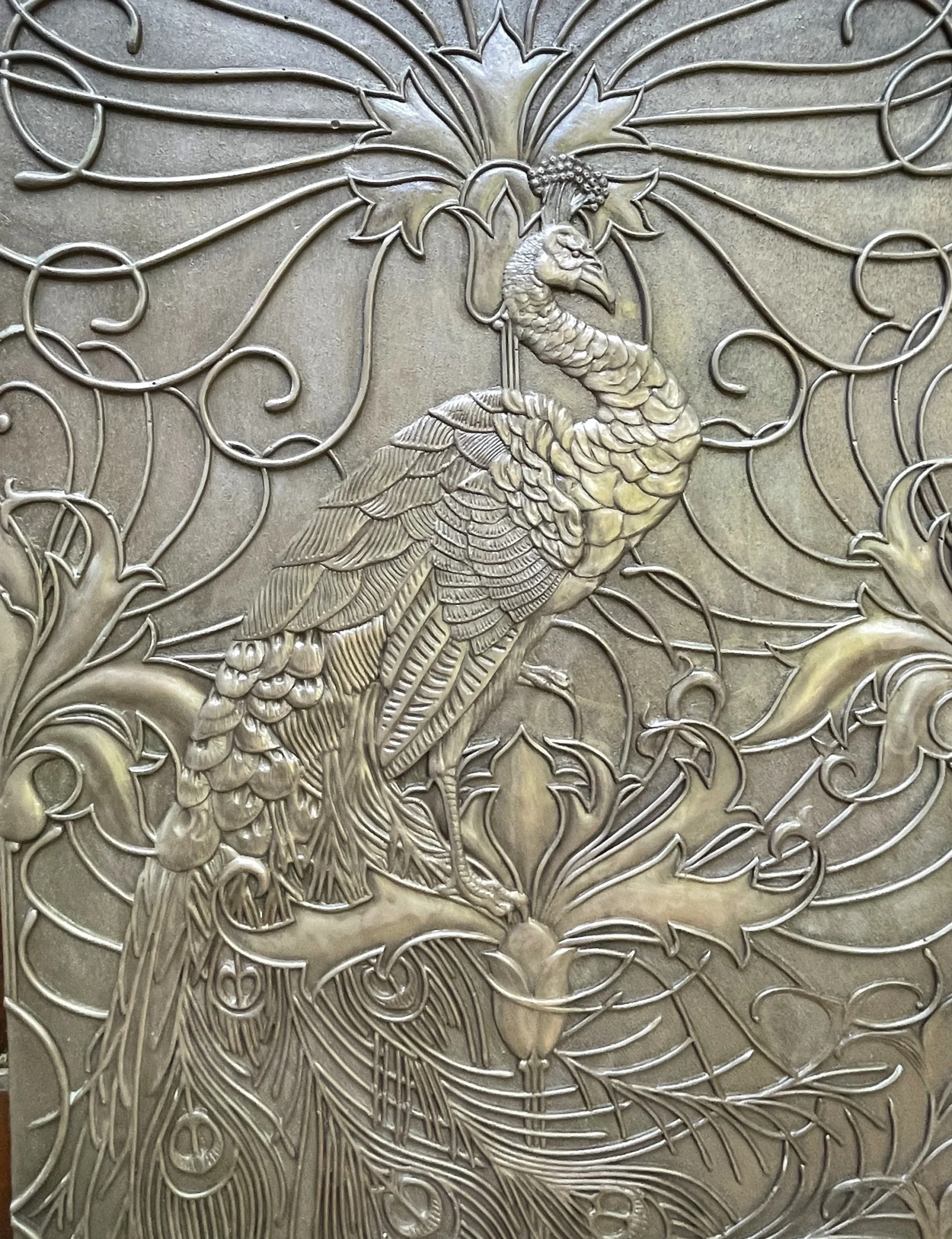 A stunning art deco peacock design with an off-set repeat, originally created by renowned arts and crafts pattern designer George C Haite for the Paris 1900 International Exhibition. Now available exclusively from Frank Holmes Fine Decor. Shown here cold cast in bronze. Please contact us to discuss limited edition options and pricing.