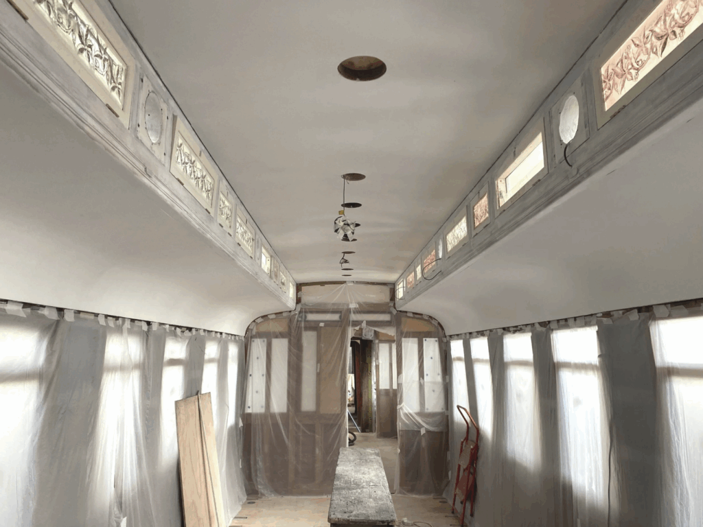 The polished gold engraved wood, fine etched glass, painted glass, and clerestory roof make this a craftsman’s delight. Several years in to the restoration, we were delighted to be involved on a small part of the journey of ECJS 189 alongside conservator, Helena Brazil of Lincrusta Heritage.