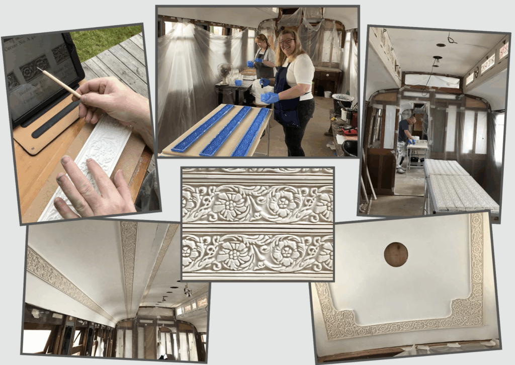 With the original black and white carriage photograph of 189 as the only reference, Helena first identified the Lincrusta border as one of two probable designs. Directors of LNERCA chose the design to reinstate, then Helena arranged for samples to be 3D printed from this 2D catalogue