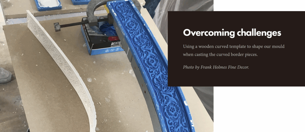 Our mission threw up it’s own challenges. The curved roof proved difficult when installing the border, despite using pieces fresh out of the mould. But, the LNERCA workshop engineers, experts at problem-solving, were on hand and quickly produced their wooden template, which we reversed to lay our mould on to successfully cast the curved sections needed.